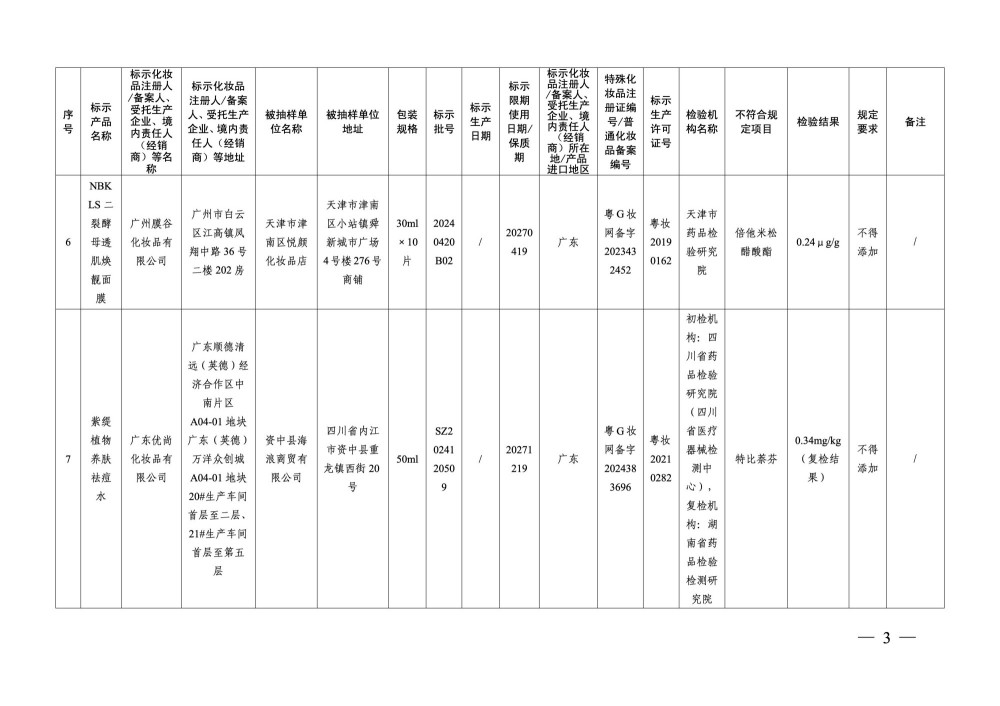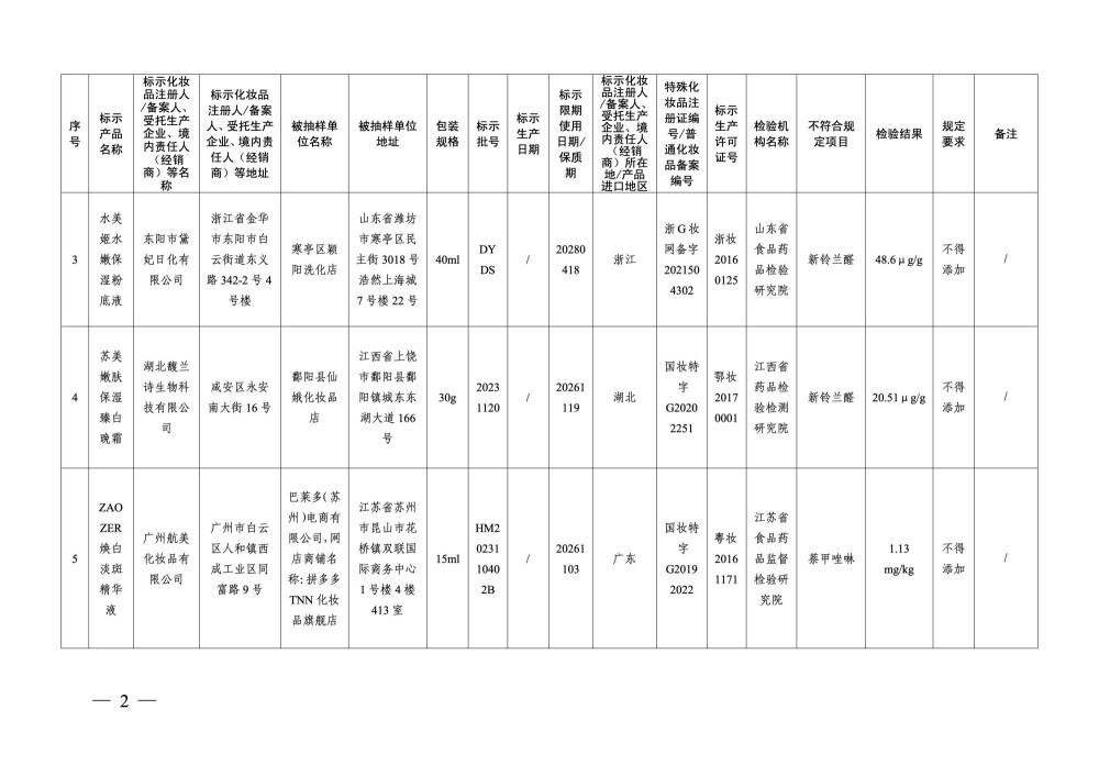 此次不合格产品涵盖进口和国产两类,标签标示名称包括薇秘水漾修颜粉底液 01、瑾泉花妍菁萃柔光雪凝 BB 霜、ZAOZER 焕白淡斑精华液、NBKLS 二裂酵母透肌焕靓面膜等。