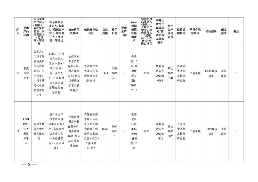检出的禁用原料包括新铃兰醛、萘甲唑啉、二氯甲烷等,这些成分可能对皮肤产生刺激,长期接触还可能危害肝肾等器官健康。其中部分卸甲水检出的二氯甲烷,属于有毒挥发性有机溶剂,会对皮肤和呼吸道造成刺激。