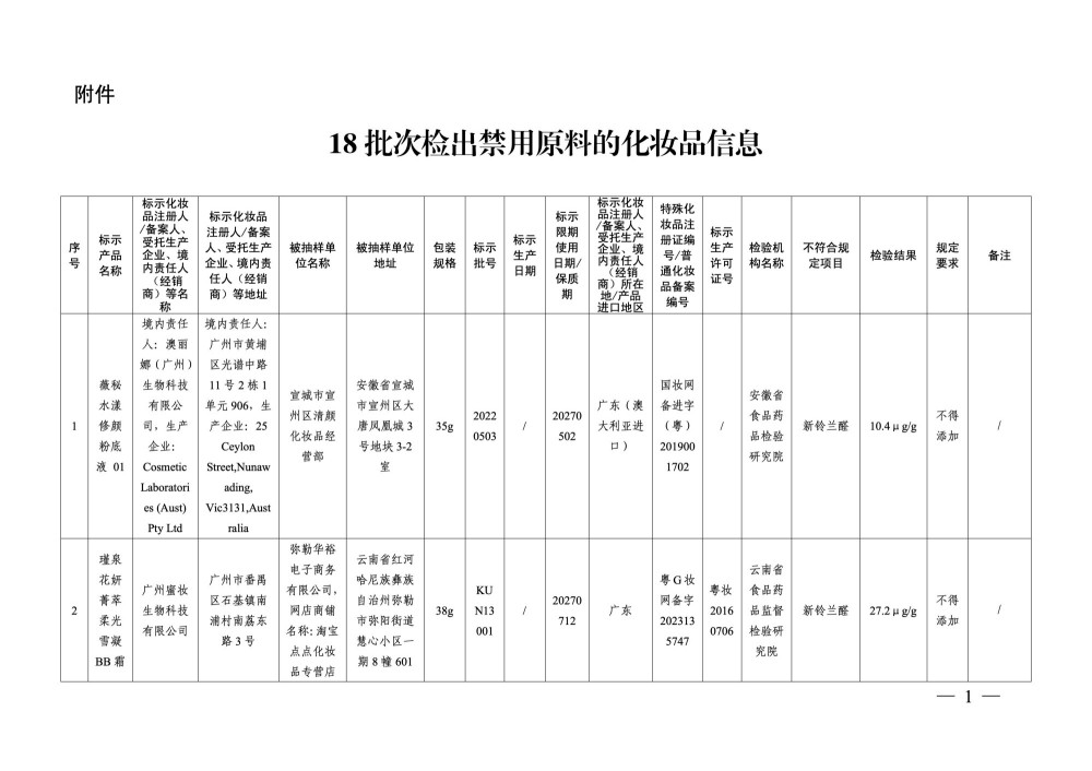 近日,国家药监局最新通报(2025 年第 46 号)显示,18 批次化妆品在抽样检验中检出禁用原料,不符合《化妆品安全技术规范(2015 年版)》要求,涉及粉底液、BB 霜、面膜、精华液等多款常用产品。
