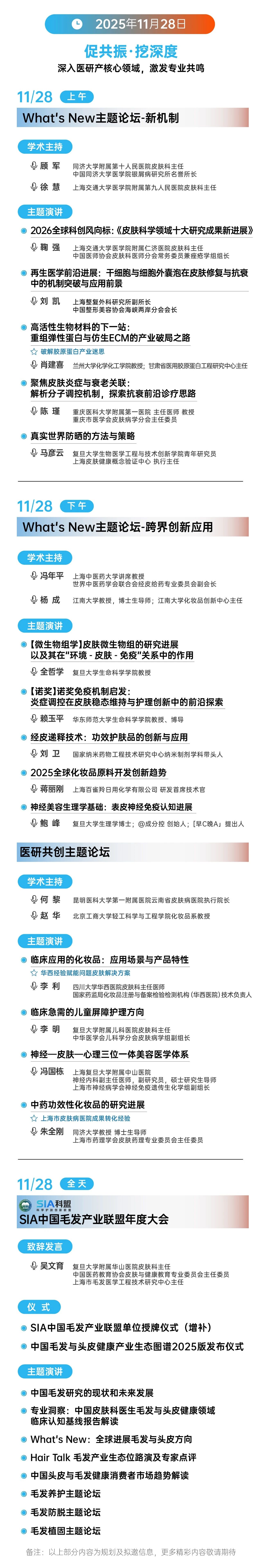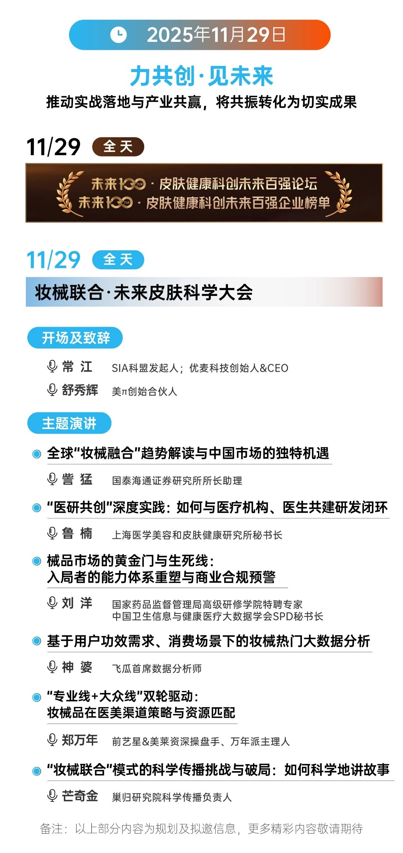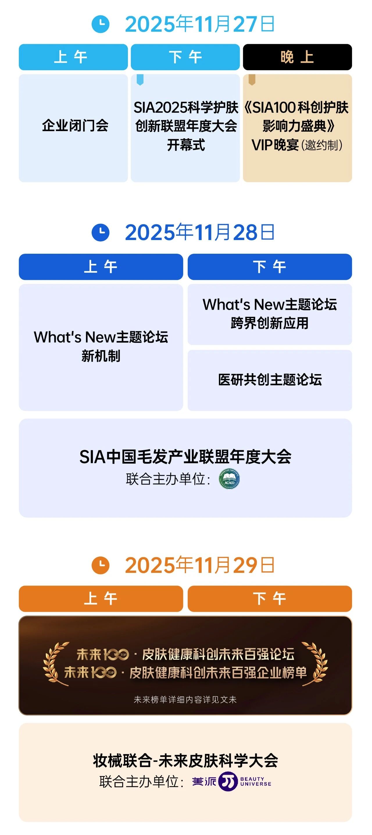 2025年皮肤健康领域的“行业风向标”已就位!SIA科盟2025年度大会主题为【美力跨界·专业无界】,定档于2025年11月27—29日在上海隆重举行。大会3天议程分别聚焦“立高度、谈前沿、看生意”,集结全球顶尖科研力量、权威医师与产业领袖,带来从学术突破到商业落地的全链路价值输出。这场盛会将成为从业者、研究者、投资者不可错过的年度机遇。